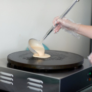 Проворно орудуя столовыми приборами — для приготовления блинов достаточно половника и лопатки — девушка поджаривает блин за две минуты, заворачивает в него выбранную начинку и подаёт готовый сытный перекус в одноразовой пищевой коробочке.