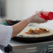 Проворно орудуя столовыми приборами — для приготовления блинов достаточно половника и лопатки — девушка поджаривает блин за две минуты, заворачивает в него выбранную начинку и подаёт готовый сытный перекус в одноразовой пищевой коробочке.