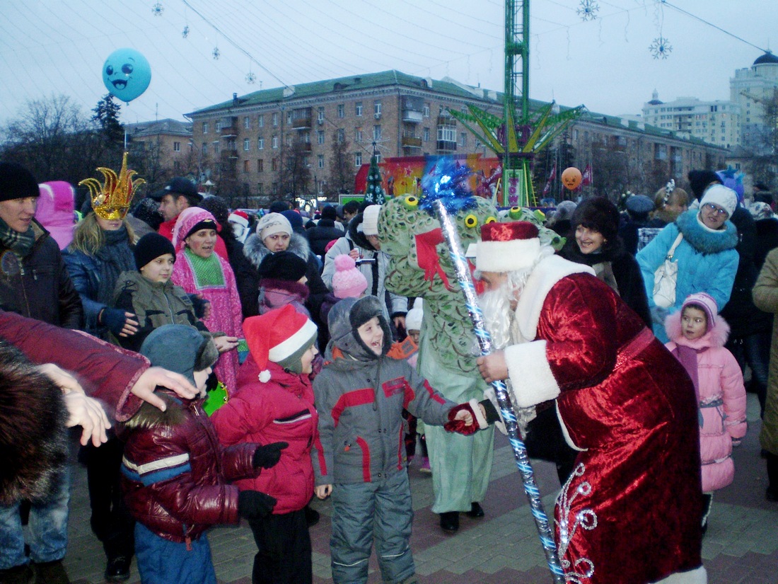 Теперь все в сборе. Можно веселиться. Услышав знакомые всем слова «А ну-ка давай-ка, плясать выходи…», весёлые и озорные малыши начали водить хороводы. Не остались в стороне и взрослые. А Деды Морозы со своими внучками и другими помощниками: Метелью, Снеговиком, Бабой Ягой, Зайчиками - играли c детишками в разные игры. Но на минуту все застыли в ожидании. Взгляды устремились на зелёную новогоднюю красавицу. Буквально мгновение - и главная 25-метровая ёлка засверкала яркими огнями…